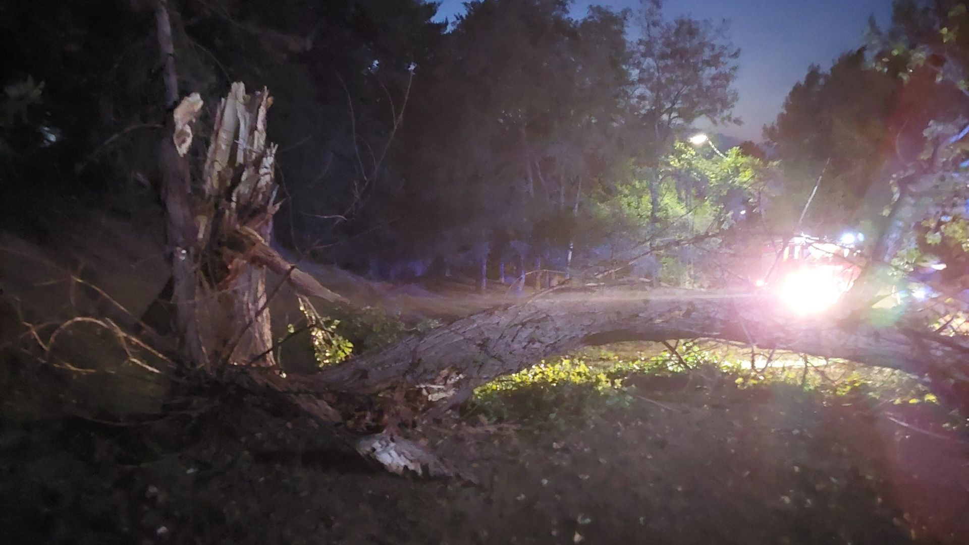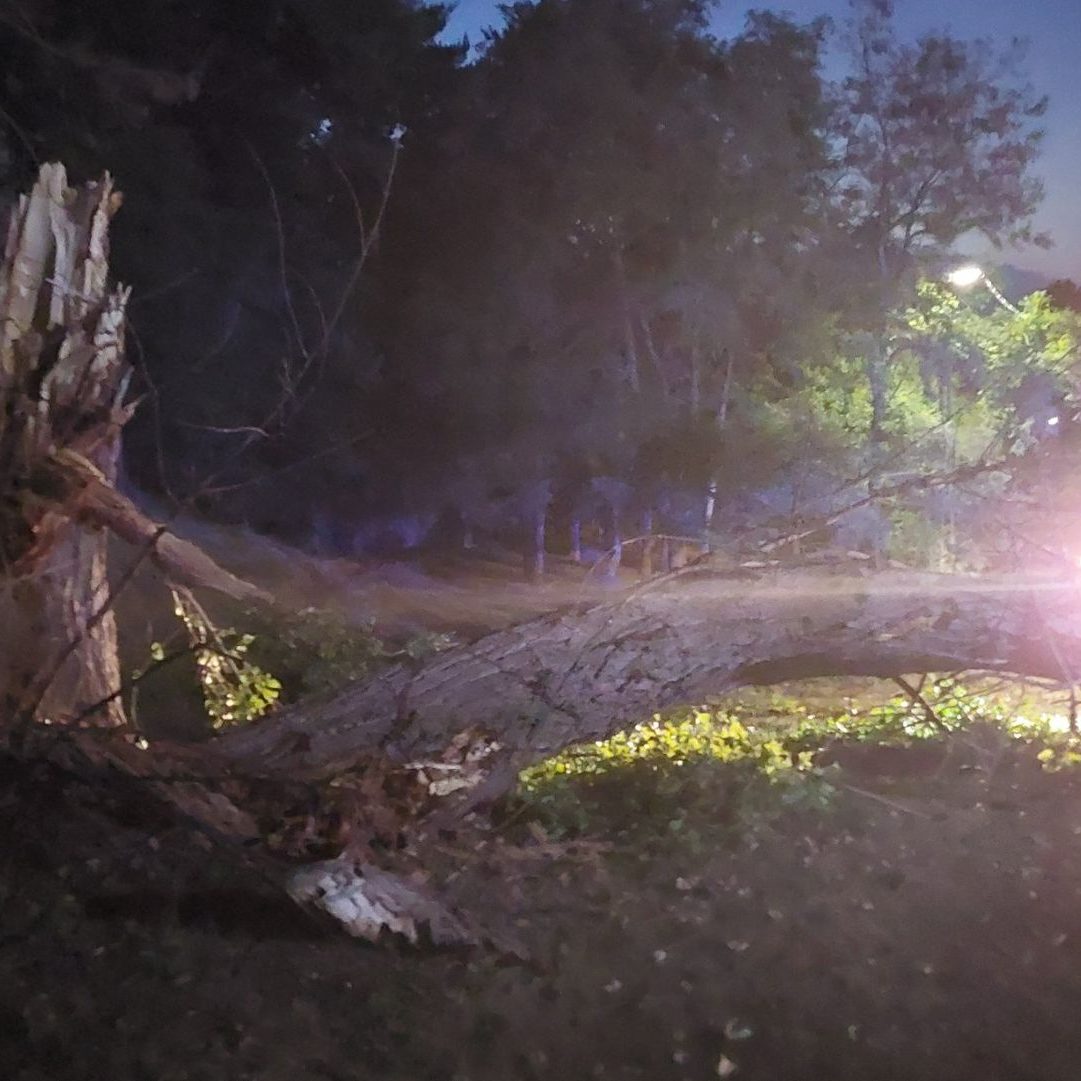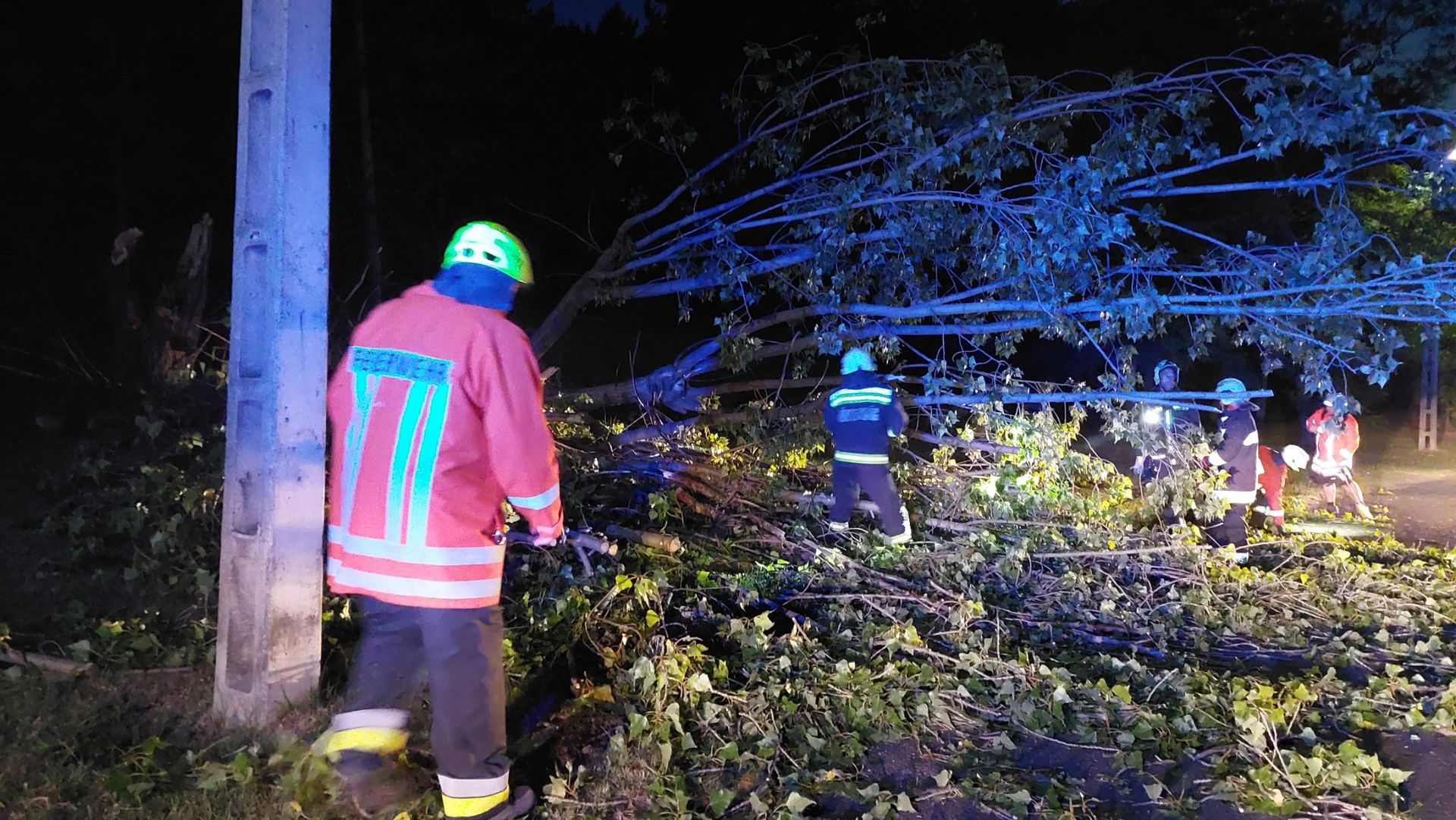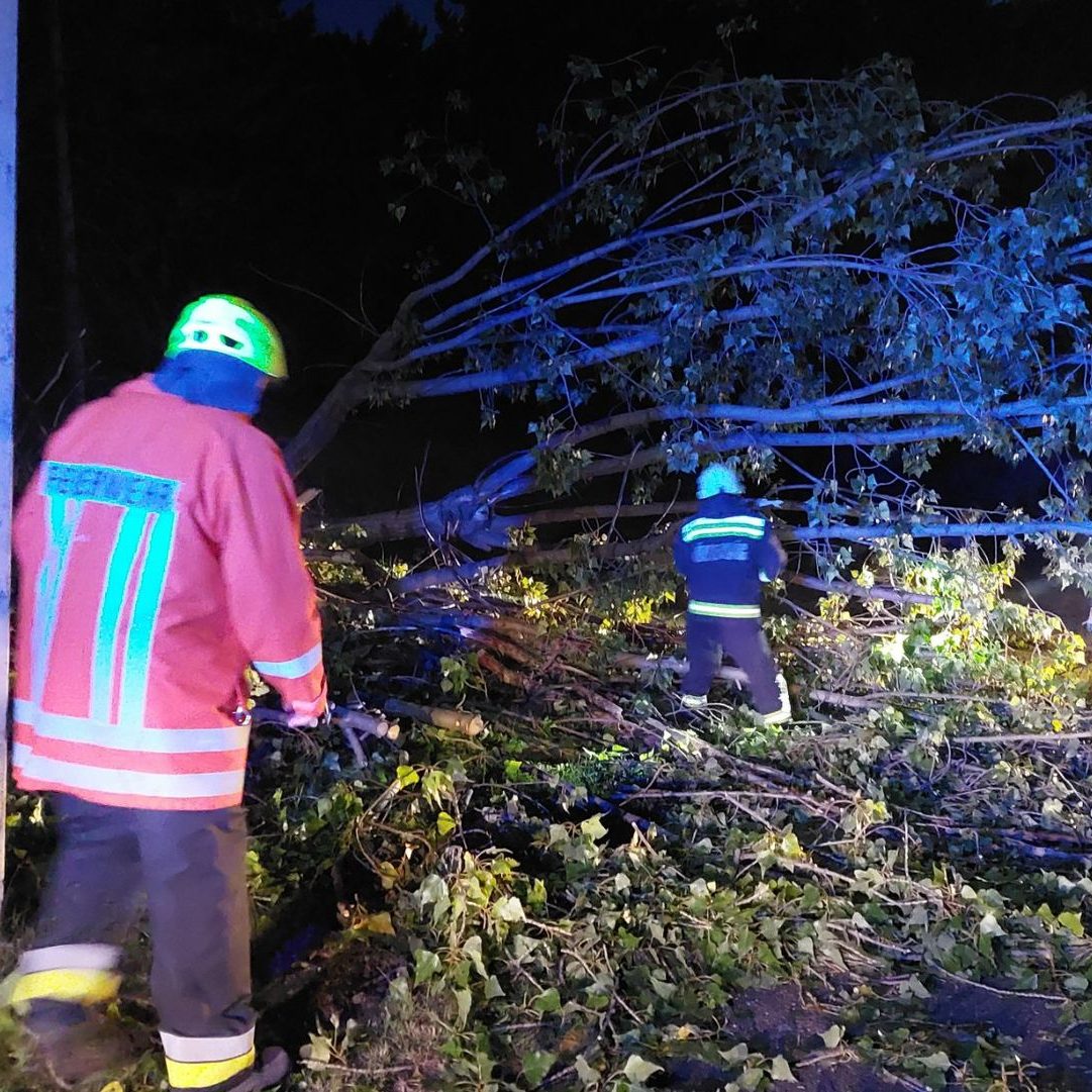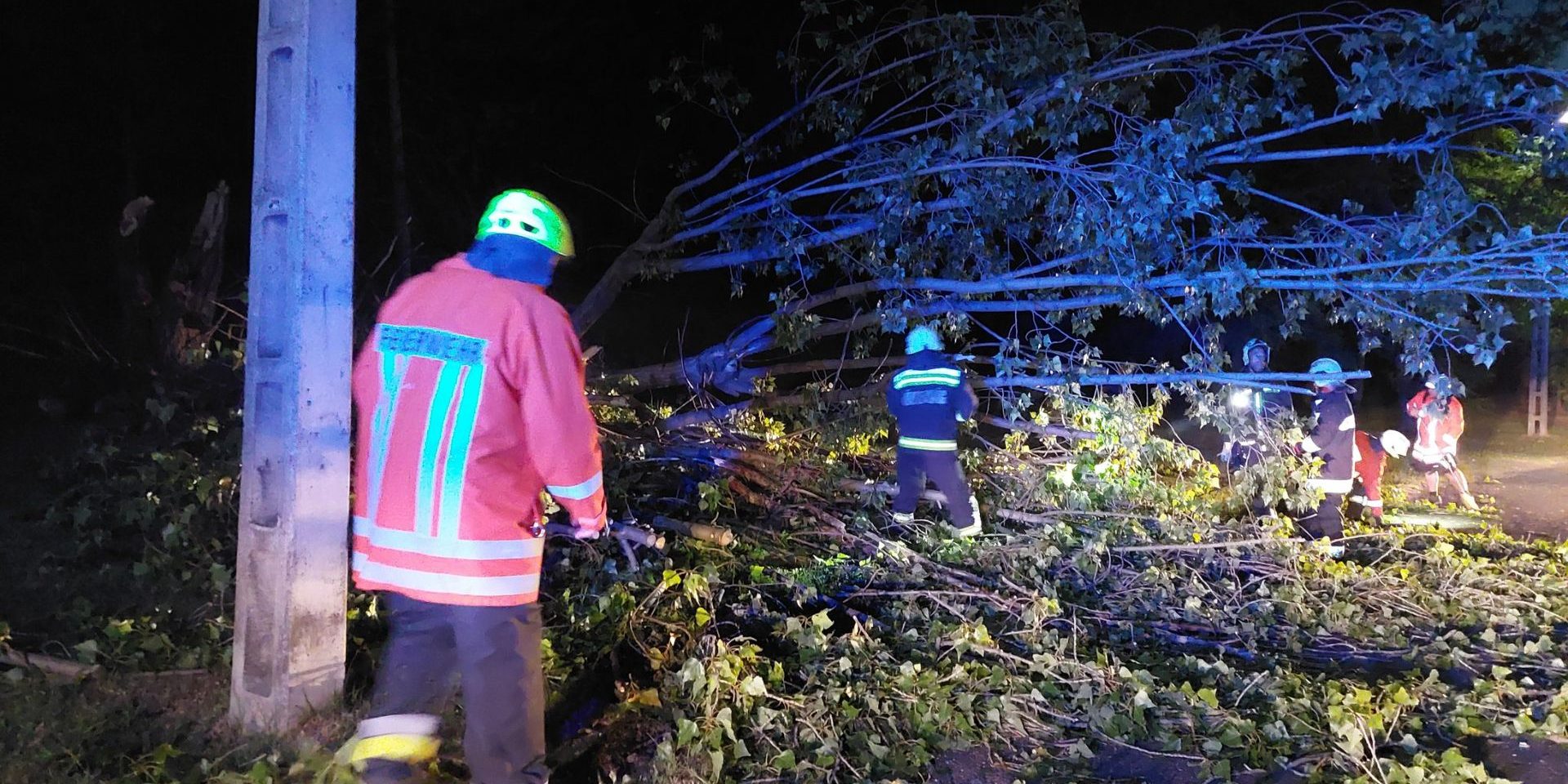 Nyergesújfalun az új temető közelében, a péntek késő esti viharos erejű szél kidöntött egy hatalmas fát. Az ágak leszakították az elektromos felsővezetéket. A kidőlt fa forgalmi akadályt képezett. A helyszínre kiérve az áramütés veszélyét elhárítva, láncfűrész és kéziszerszámok igénybevételével járhatóvá tettük az utat.