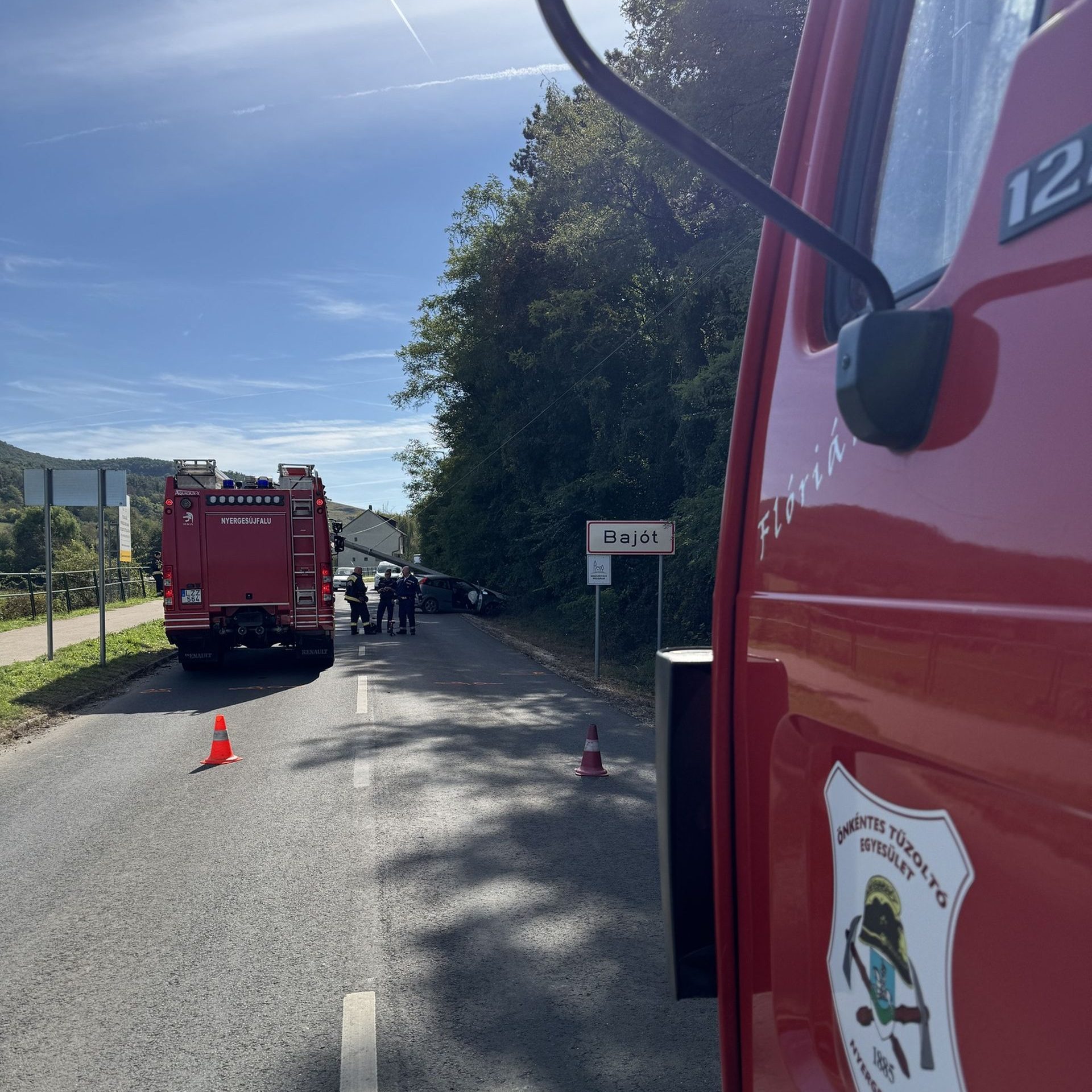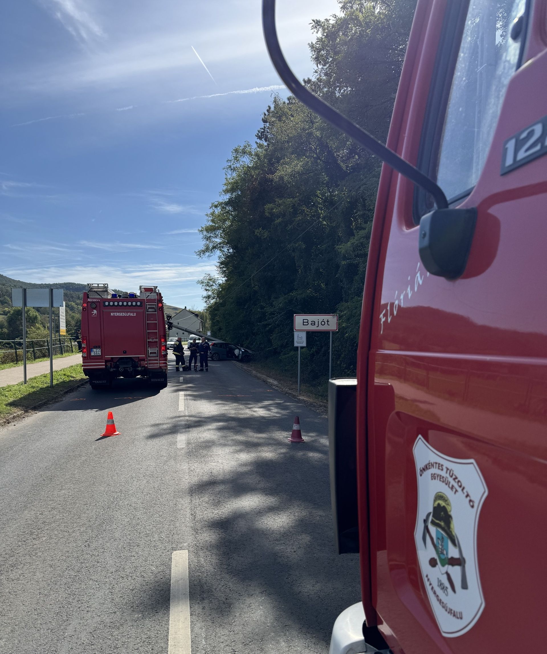 A délben kaptunk riasztást a Megyei Műveletirányítástól, miszerint Bajóton a főutcán közlekedési baleset történt. Egy személyautó villanyoszlopnak csapódott és teljes útzárt képez. A nyergesújfalui hivatásos egységgel biztosítottuk a területet, a rendőrség és az EON kiérkezéséig. A műszaki mentés jelenleg is tart!